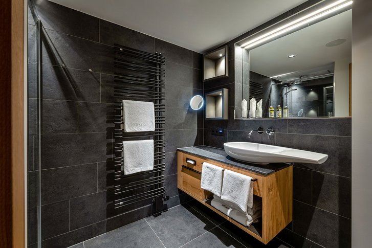 Gemütliche Juniorsuite in modern-alpinem Ambiente, geschmackvoll ausgestattet mit Eichenholz-Möbeln, Holzboden, Sitzecke und geschlossenen Badezimmer mit Dusche. Das Badezimmer ist zudem versehen mit Rainshower, Coiffeur-Föhn, Kosmetikspiegel, Handtuchtrockner, Bluetooth-Musikanlage und getrenntem WC.